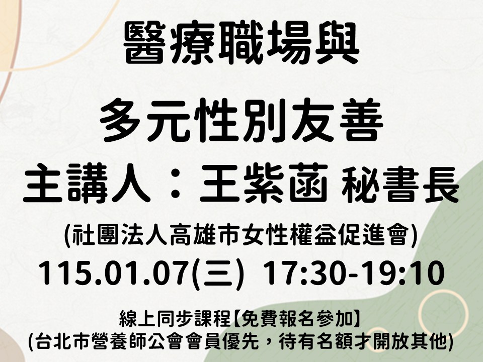📢台北市營養師公會訂於115年01月07日(三)17:30-19:10舉辦長照積分線上視訊課程,提供需要長照特殊積分的會員累積積分,